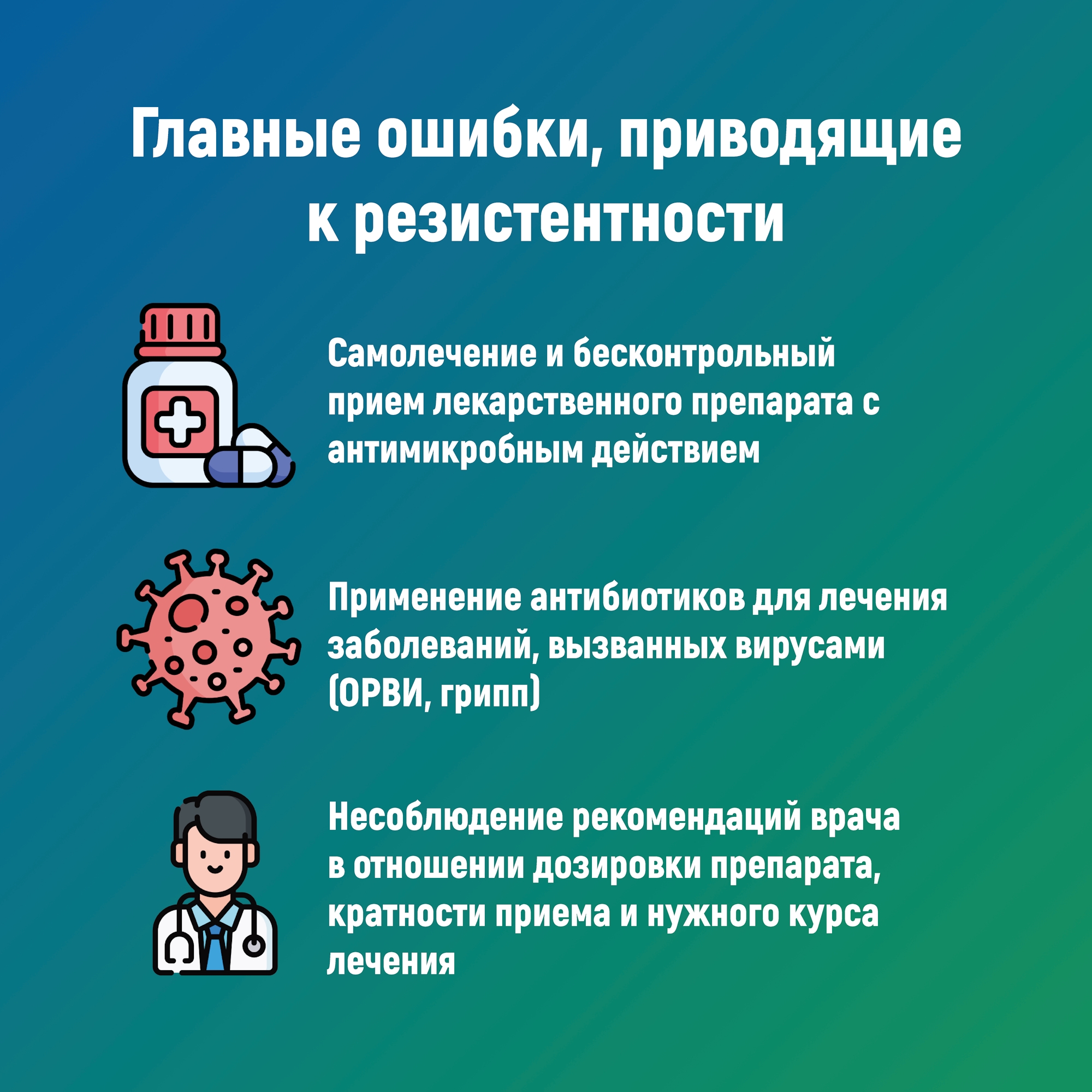 Антимикробная резистентность — проблема, которая развивается незаметно, но затрагивает каждого. Она возникает не сама по себе: чаще всего её ускоряют наши собственные привычки, ошибки и невнимательность к назначенному лечению.